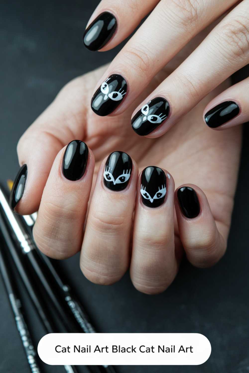 - Apply a high-quality black cat eye polish evenly on all nails.